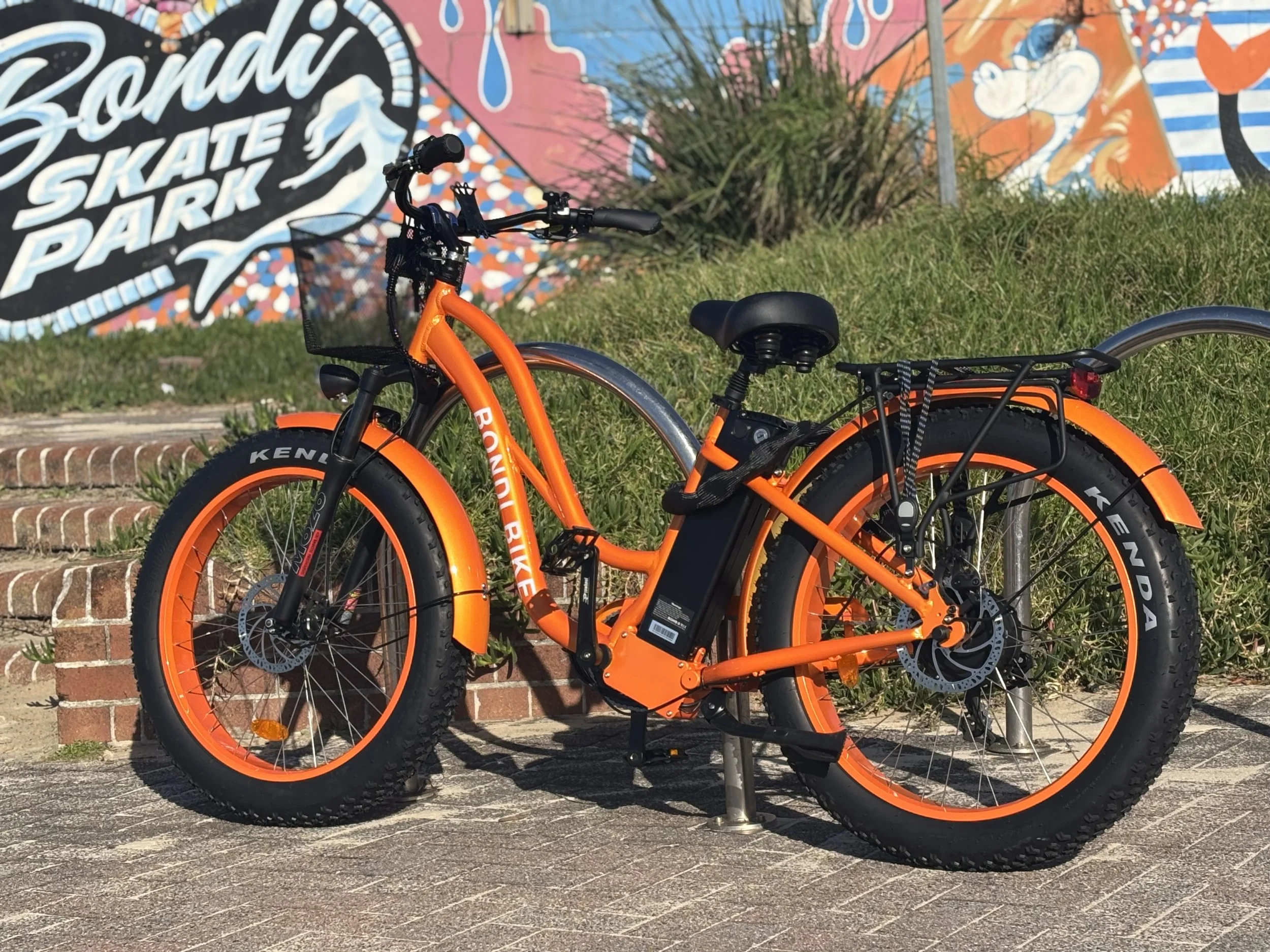 A: These are high-quality pedal-assist e-bikes with a 250W Bafang motor and a 36V Samsung battery, perfect for cruising Bondi’s hills. They feature a comfortable suspension fork and suspension seat, wide 26×4” tires, disc brakes, mudguards, and front/rear LED lights — all in vibrant orange.